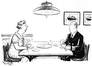 "It's all very well for you, but I'm the one who has to explain to the neighbors how come you've had five ships sink under you and you've never gone down with any of them."  (Jan 18, 1958)